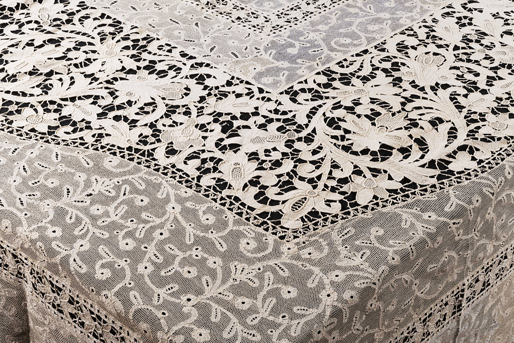 Importante corredo da tavola composto da: tovaglia rettangolare a punto...