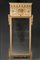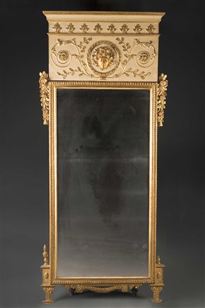Specchiera in legno dorato ed intagliato con motivi a fiori, foglie e pinnacoli. Cimasa laccata a fondo avorio e decorata a mascherone con volute fogliate e motivi vegetali. Sec XVIII (cm 187x85)(restauri) 18th-century carved gilt wood dressing table (restorations)