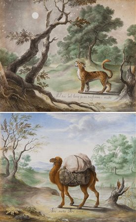 Maestro del sec. XVIII Coppia di tempere su pergamena raffiguranti animali...
