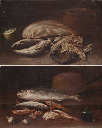"Natura morta con pesci, canocchie, ostriche e limoni" "Cefalo, triglie, aglio, pentola di rame e contenitore d'olio" coppia di olii su tela (cm36,5x56). In cornice "Still nature with fish, squills, oysters and lemons" and "Grey mullet, red mullets, garlic, copper pot and oil jug" pair of oil paintings on canvas