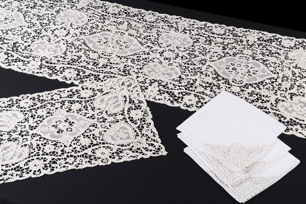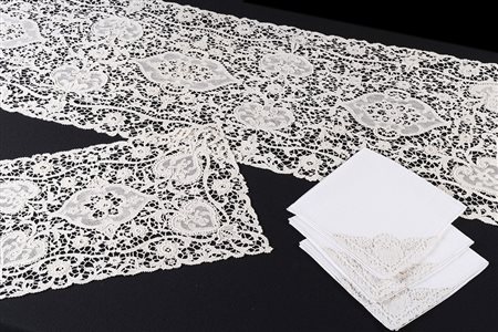 Servizio all'americana composto da dodici tovagliette , una striscia centrotavola a tombolo in punto ago antico Venezia e dodici tovaglioli con angolo. Sec. XIX (cm 28x40 - 117x40) (lievi difetti) 19th-century table set comprising twelve mats, a runner and twelve napkins (minor defects)