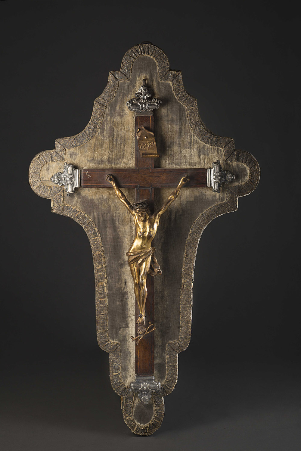 Arte del sec. XVIII "Cristo Crocefisso" scultura in bronzo dorato (h cm 25) con croce in legno filettato . Terminali decorati da fregi in argento. Montata su pannello in velluto (difetti) 18th-century art "Christ on the cross" gilt bronze sculpture mounted on a velvet panel (defects)