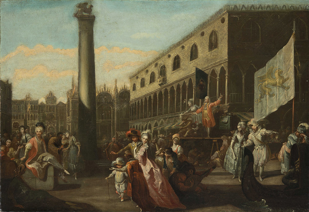 "Scena animata in Piazza San Marco con ciarlatano, personaggi settecenteschi...