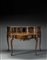 Scrivania di forma mossa in noce e radica, piano con alzata a quattro...