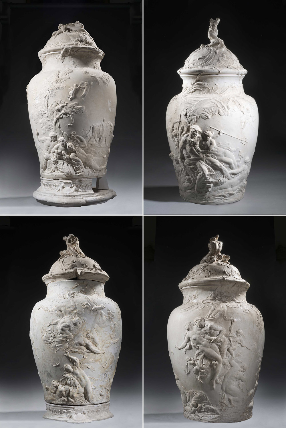 Gruppo di quattro rari vasi con coperchio in gesso decorati in rilievo con Allegorie dei Quattro Elementi: Aria, Fuoco, Terra e Acqua. L'elemento Fuoco è rappresentato su un lato da Apollo che guida il carro del Sole circondate dalle Ore e delle Passioni e sull'altro da Vulcano e Marte. L'elemento Acqua è rappresentato dal Trionfo di Nettuno e Anfitrite. L'elemento Aria è rappresentato dalle divinità dei Quattro venti (Borea, Zefiro, Euro, Austro) e da un albero scosso dal vento. L'elemento terrà è rappresntato dall'Allegoria della Famiglia Felice, al retro testa di Medusa che infiamma la Guerra in basso la figura di una donna che implora la Pace (cm 90; elemento aria h cm 60); (difetti) (mancanze all'origine) Per questo lotto è disponibile l'Attestato di libera circolazione. Group of four plaster vases decorated with the allegory of the four elements. Export licence available for this lot.