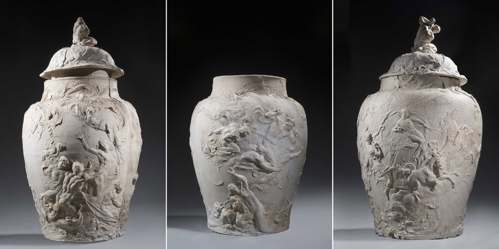 Gruppo di tre rari vasi con coperchio in gesso decorati in rilievo con Allegorie di Tre elementi. Fuoco è rappresentato dalla Passione tra due amanti (Amore e Psiche ? ). L'elemento Acqua è rappresentato da Nettuno, Anfitrite e il Regno marino. L'elemento Aria è rappresentato dalle divinità dei quattro venti Borea, Zefiro, Euro e Austro (cm 90; elemento aria h cm 60) (difetti)(l'elemento aria senza coperchio) Per la scheda completa consultare il lotto 1054. Per questo lotto è disponibile l'Attestato di libera circolazione. Group of three plate vases decorated with the allegory of three of the four elements. Export licence available for this lot.