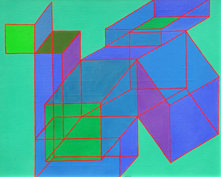 Achille PERILLI Roma 1927 L'opulento compendio, 1982, acrilico su tela, cm. 65 x 81, Firma, data 'Perilli, 82' (in basso al centro) #Firma, data, titolo, misure 'Achille Perilli, 1982, L'opulento compendio, 65x81'; #etichetta e timbro della galleria Spriano, Omegna; #etichetta della Fiera Internazionale di Arte Contemporanea, Bari, 1989 (al retro) Autentica dell'artista su fotografia