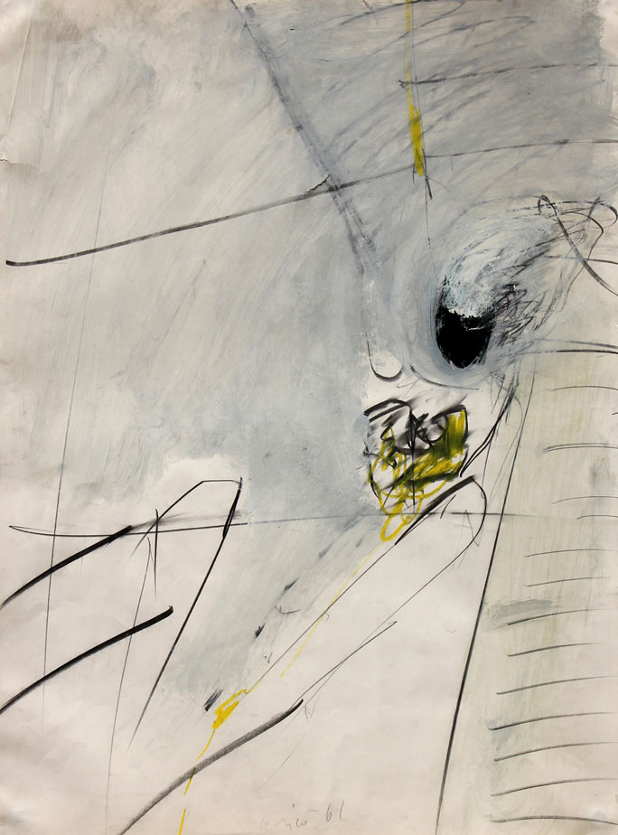 Rodolfo ARICO' Milano 1930 - 2002 Composizione, 1961, tecnica mista su cartoncino, cm. 67 x 49, Firma, data 'Aricò, 61' (in basso al centro) #Etichetta della galleria Bottega d'Arte, Acqui Terme (al retro)