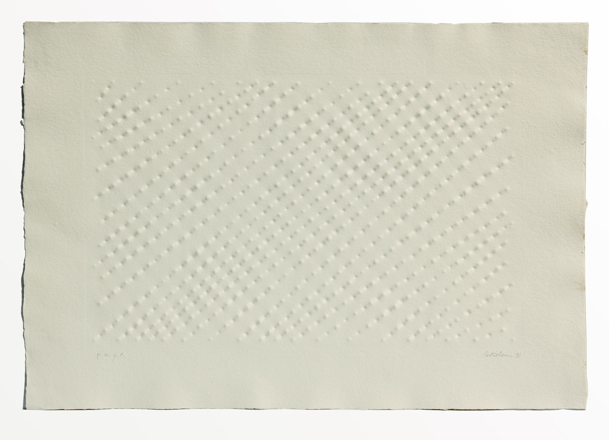 Enrico CASTELLANI Castelmassa 1930 Superficie, 1992, carta Moulin du Guet estroflessa, cm. 62 x 90.3, 'Enrico Castellani - Opera grafica 1960-1995', Corraini Editore, Mantova, 1995, n.38, Edizione di 100 esemplari #Stampatore ed editore Severgnini - Cernusco sul Naviglio (MI) #Firma, data 'Castellani 92' (in basso a destra) #Numerazione 'p.a.f.c.' (in basso a sinistra)