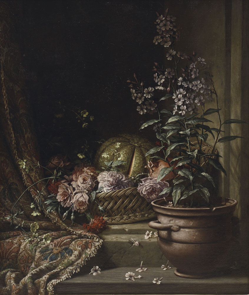 SCUOLA FRANCESE DEL XIX SECOLO Natura morta con vaso di fiori, cesto con...