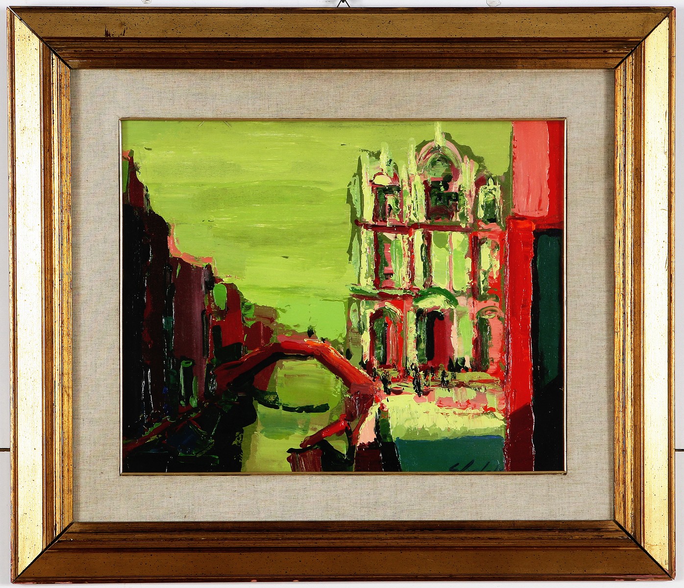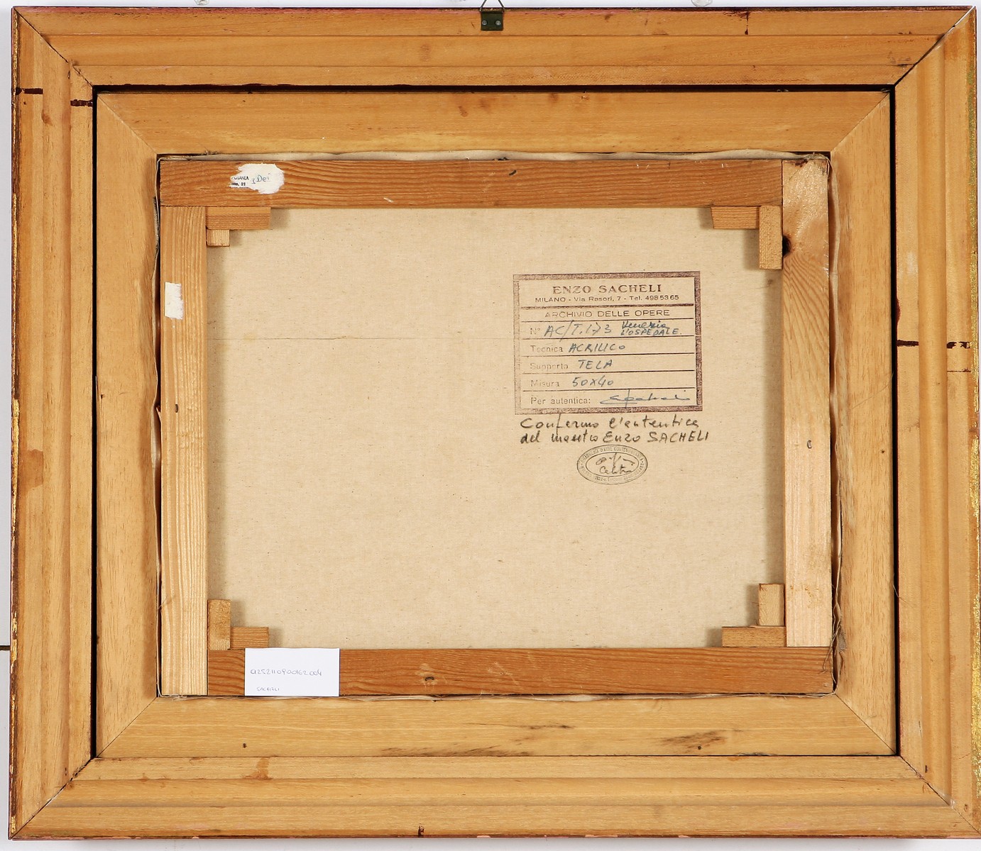 Firma in basso a destra. Al retro timbro dell'artista con un numero d'archivio; timbro della Quadreria D'Arte Contemporanea, Milano. Cornice presente.