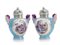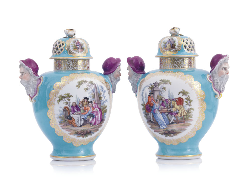 COPPIA DI VASI IN PORCELLANA CON COPERCHIO, DRESDA, XIX SECOLO, ovoidali con anse a teste virili, decoro policromo entro doppie riserve a cartigli in oro a scene alla Watteau con giochi all'aperto e motivi floreali su fondo turchese; coperchi traforati con prese a bocciolo, profili in oro e greche a motivi fitomorfi; marca con monogramma "AR" in blu sotto smalto.