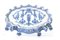 CENTROTAVOLA IN MAIOLICA, XVIII SECOLO, ovale a profilo mistilineo su piedi ferini e teste di putto, decoro in blu alla Bérain; fessura e sbeccature.
