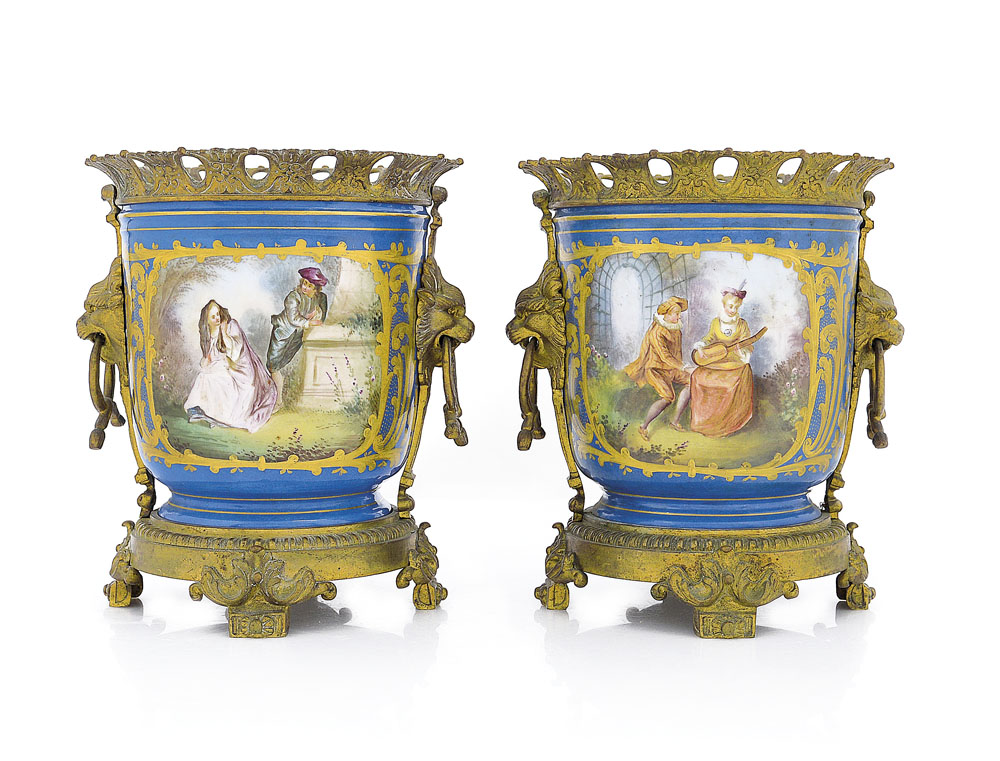 SEVRES COPPIA DI CACHEPOT IN PORCELLANA E BRONZO DORATO, FINE XIX SECOLO,...