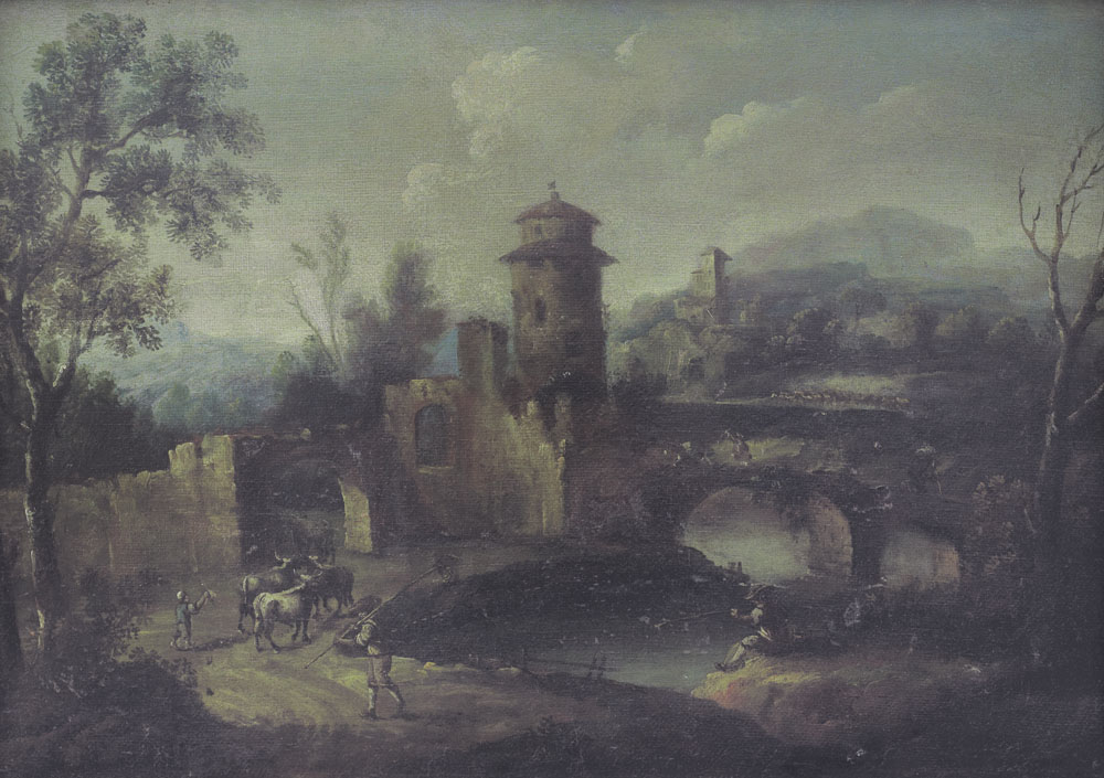 SCUOLA VENETA DEL XVIII SECOLO Paesaggio fluviale con ponticello e figureOlio...