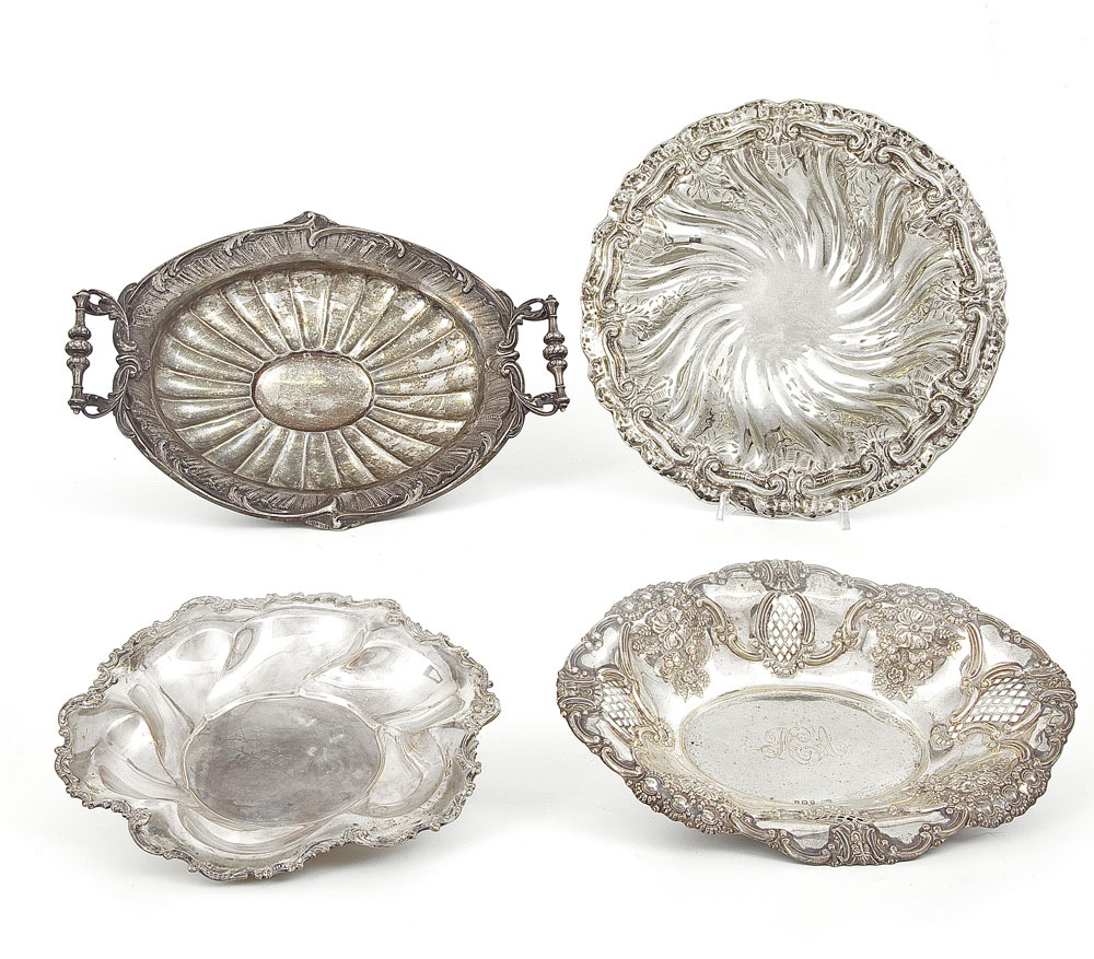QUATTRO CENTROTAVOLA IN ARGENTO, XX SECOLO, di cui uno Birmingham, 1906, sagomati con decori sbalzati e profili mistilinei.