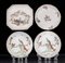 PIATTO IN PORCELLANA, MEISSEN, 1740 CA., ottagonale con decoro policromo a scene di porto entro riserva a cartigli in oro; usure; unito a TRE PIATTI IN PORCELLANA, XVIII SECOLO, due con decoro a pavone su ramo e fiori e uno Meissen decoro floreale; fessure.