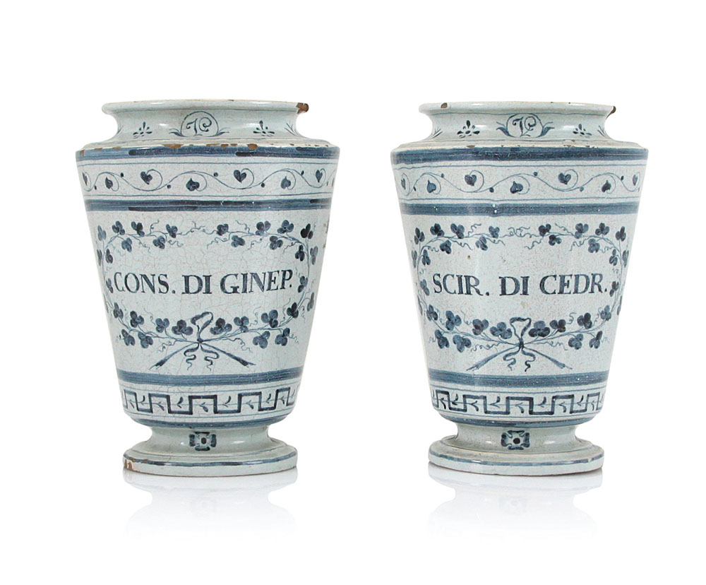 COPPIA DI ALBARELLI IN MAIOLICA, SAVONA, FINE XVIII SECOLO, decori in blu con scritta del contenuto entro ghirlande di fiori e greche; mancanze e fessure.