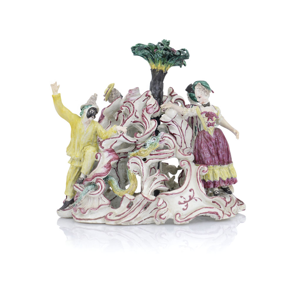 GRUPPO IN MAIOLICA POLICROMA, SAVONA, PROBABILMENTE G.BOSELLI, XVIII SECOLO, con quattro figurette danzanti e musicanti in maschera su volute rocaille centrata da palma; probabile restauro.
