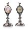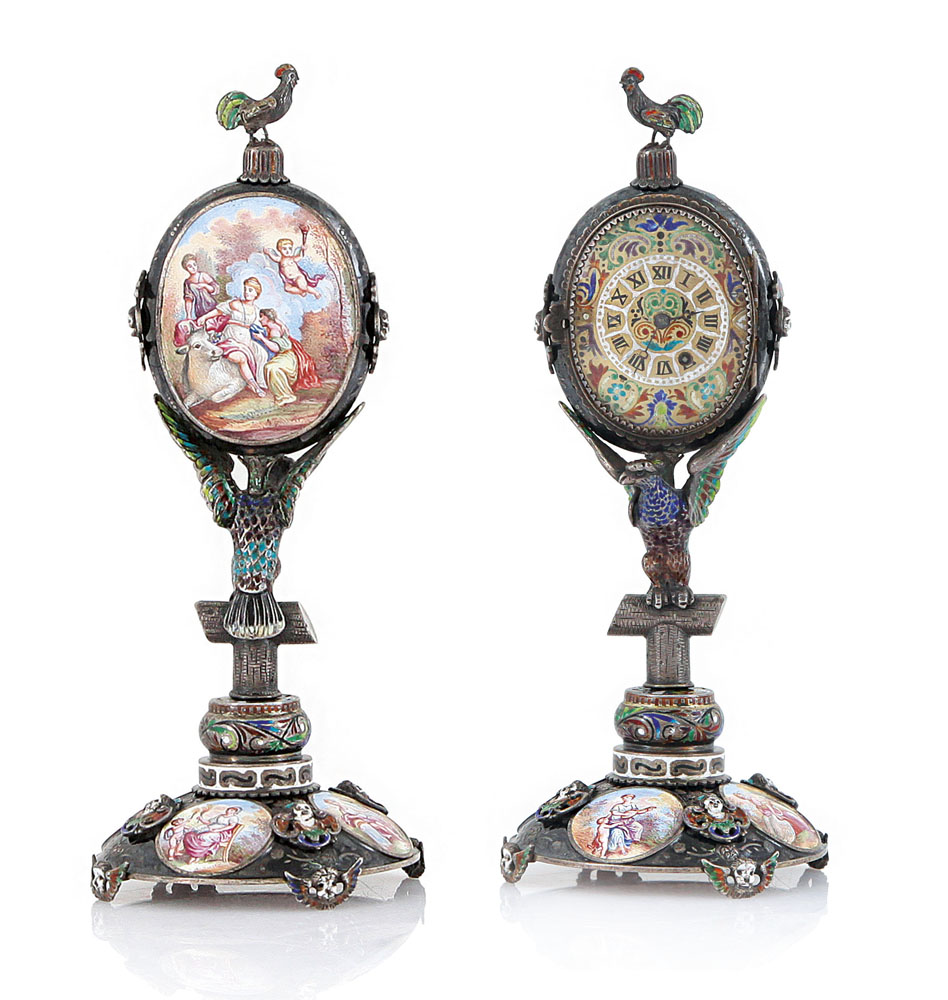 OROLOGIO DA TAVOLO IN ARGENTO E SMALTI POLICROMI, VIENNA, XIX SECOLO, cassa ovale con sostegno a rapace su trespolo e base circolare, cimatura a gallo, decori policromi con scene mitologiche entro riserve; lievi difetti e da revisionare.