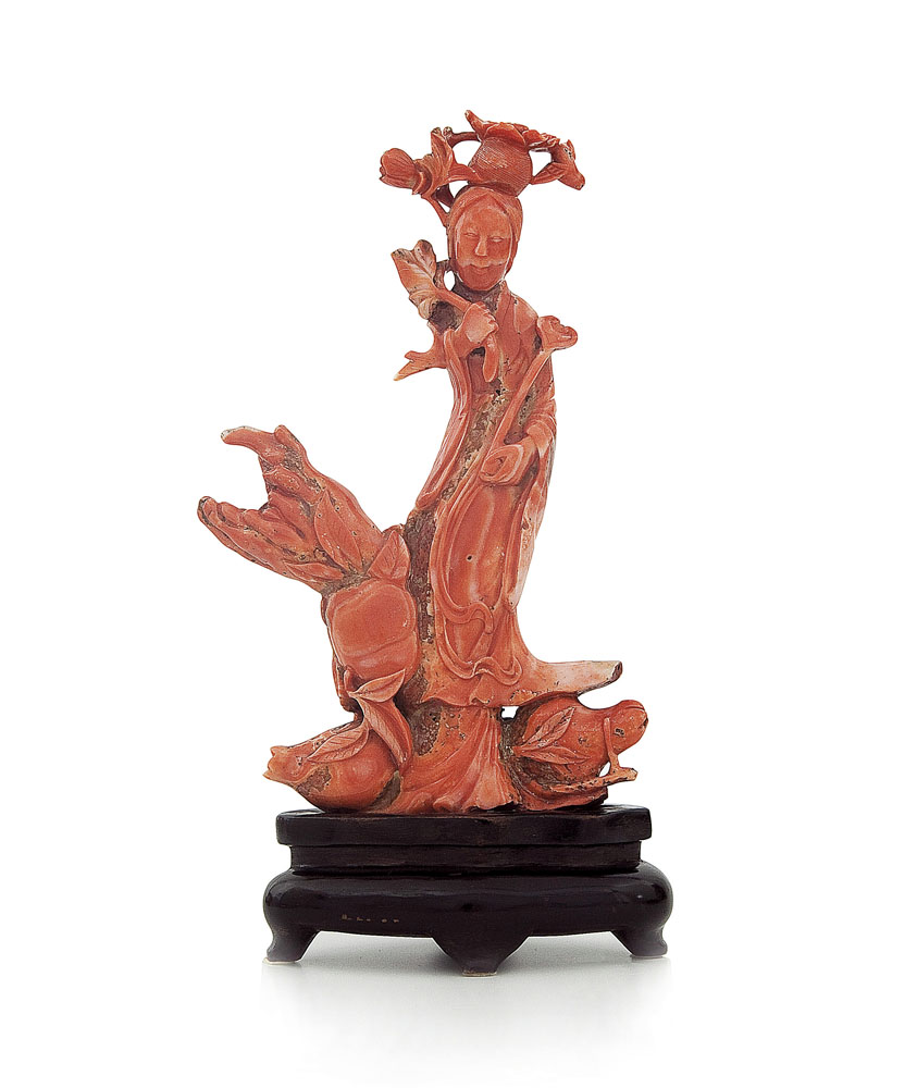 CORALLO QUANIN IN CORALLO, XX SECOLO, con fiori e frutti; base in legno. Peso lordo gr. 610, alt. cm 25,5 totale.