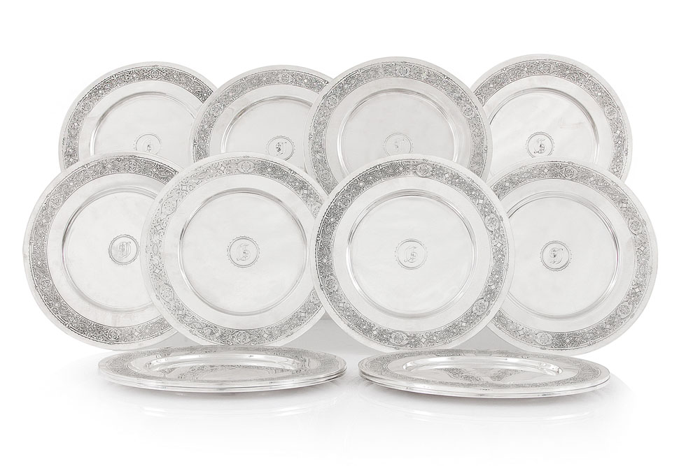 DODICI SOTTOPIATTI IN ARGENTO, TIFFANY & CO., INIZIO XX SECOLO, circolari centrati da lettera a rilievo entro riserva, tese a decori fitomorfi incisi.