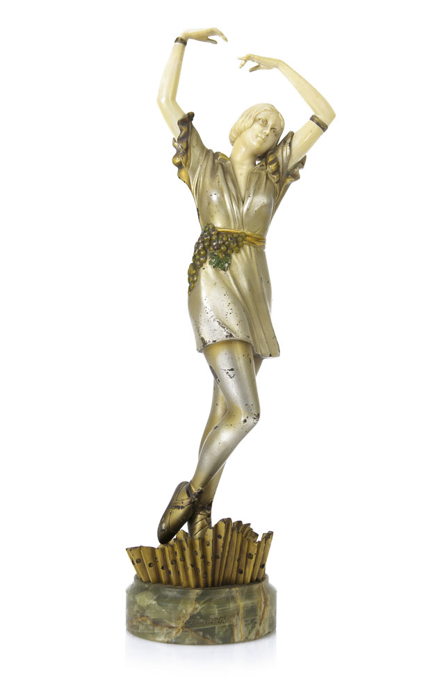 Metallo smaltato e avorio su base in onice, firma incisa, alt. totale cm 35,7; restauri e mancanze.