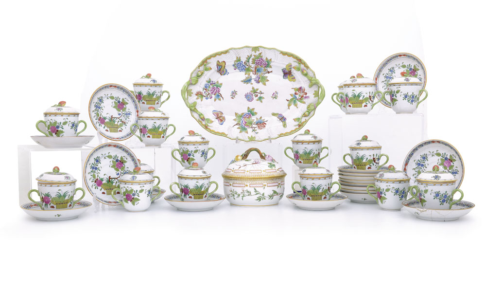 HEREND SEDICI CREMIERE CON COPERCHIO E PIATTO E UN VASSOIO IN PORCELLANA,...