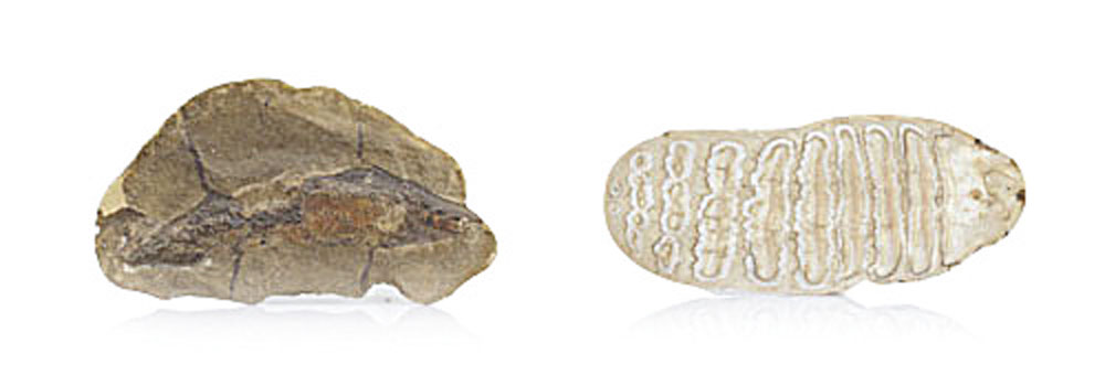 LOTTO DI DUE REPERTI FOSSILI, PERIODO CRETACEO, composto da un rettile con quattro sottili zampe e un dente di mammuth.