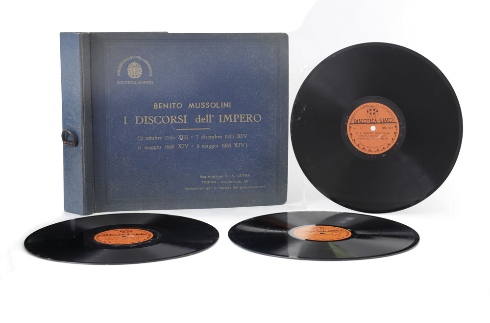 COFANETTO CON "I DISCORSI DELL'IMPERO DI BENITO MUSSOLINI", DISCOTECA DI STATO, MINISTERO PER LA STAMPA E LA PROPAGANDA, 1935-36; completo di dodici dischi in vinile; lievi usure.