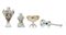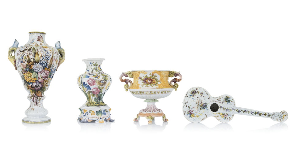 UN VASO CON BASE IN CERAMICA, BASSANO, MANIFATTURA G.B.VIERO, META' XIX SECOLO, unito a DUE VASI E UN MODELLO DI CHITARRA IN CERAMICA, BASSANO, XIX-XX SECOLO, decori policromi; mancanze e sbeccature.