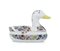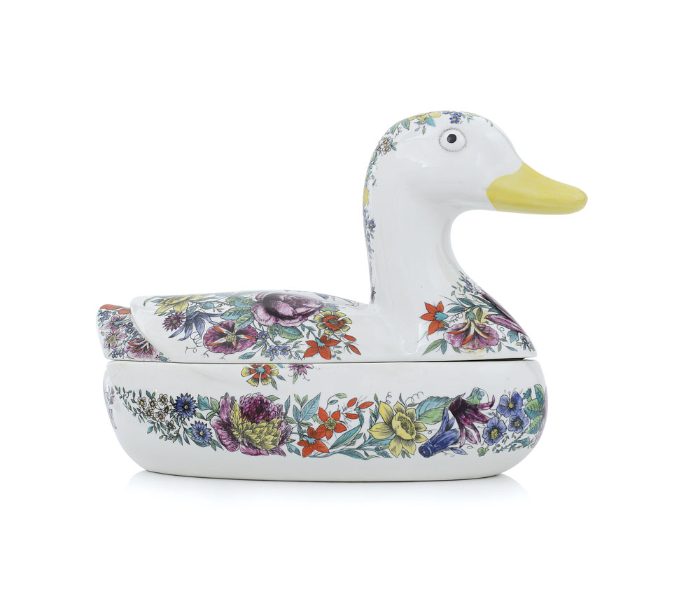 FORNASETTI ZUPPIERA CON COPERCHIO A FOGGIA DI ANATRA, P.FORNASETTI, ANNI '60, decoro a fiori policromi. Lung. cm 36.