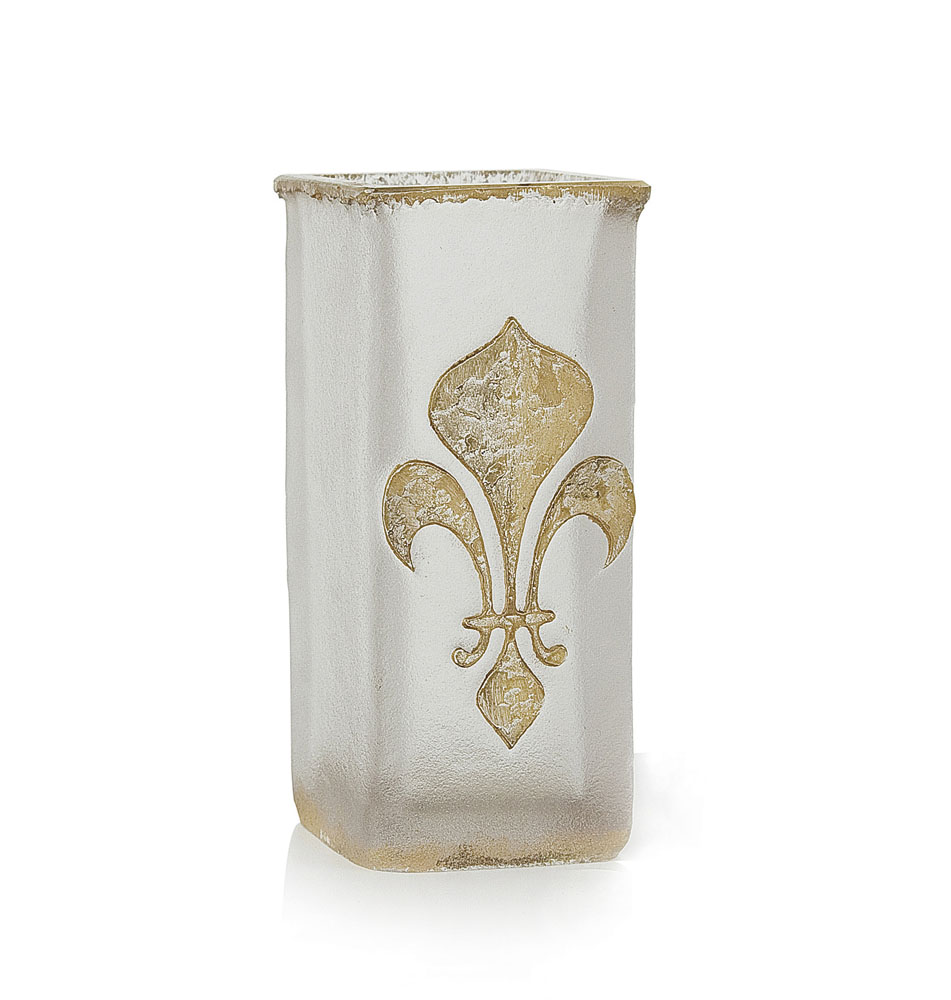 VASO IN VETRO DOPPIO, DAUM NANCY, 1892 CA., a sezione quadrata, decoro a giglio di Francia inciso ad acido e profilato in oro su fondo givré; firma in oro "Daum Nancy" con croce di Lorena.