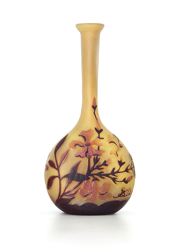 GALLE' VASO SOLIFLORE IN VETRO TRIPLO, GALLE', 1900 CA., base a bulbo, decoro...