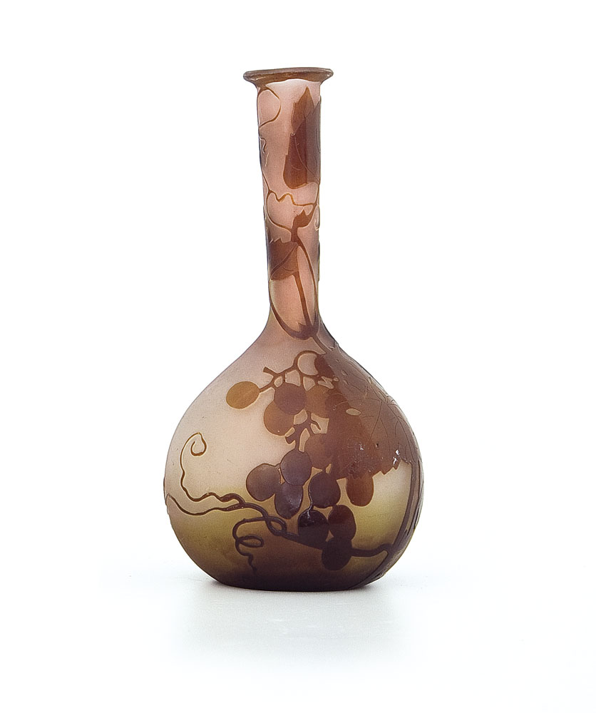VASO SOLIFLORE IN VETRO DOPPIO, GALLE', 1900 CA., base a bulbo, decoro a grappoli d'uva e foglie inciso ad acido nei toni del bruno su fondo rosato sfumato, firma in rilievo a cammeo "Gallé".