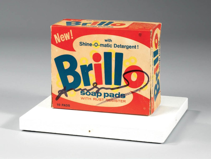 Andy Warhol Pittsburgh 1928 - New York 1987 Brillo box Scatola di cartone in teca di plexiglass, cm. 25,5x23,7x20,3 (teca) Firma su un lato: Andy Warhol.