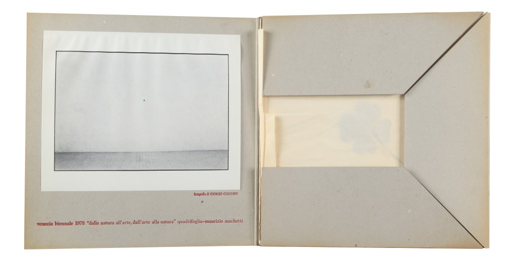 cartella contenente una fotografia di Giorgio Colombo dell'installazione alla biennale e una carta con applicato un vero quadrifoglio