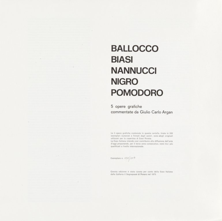 edizione curata dalla Galleria Il Segnapassi (Pesaro) nel 1973 per la copertina Esso rivista