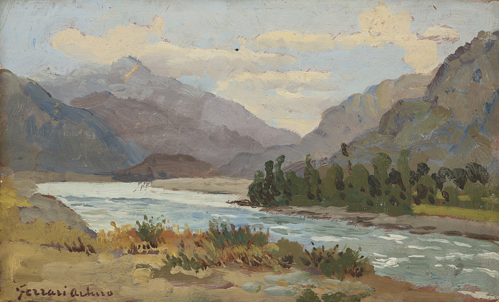 Arturo Ferrari (Milano 1861 - 1932) - "La Dora Baltea" olio su cartone (cm 14.5x24) Firmato in basso a sinistra Al retro: titolato ed iscritto In cornice