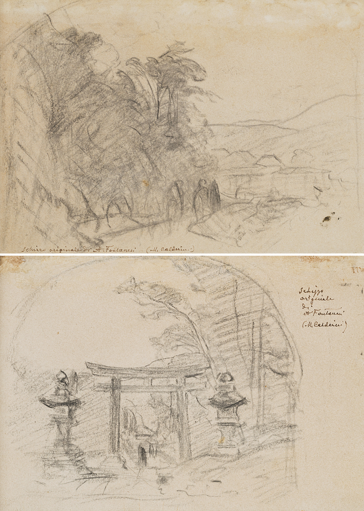 Antonio Fontanesi (Reggio Emilia 1818 - Torino 1882) - "Il portale sacro del santuario di Hakone" matita su carta (cm 17.5x25) Al retro: "Paesaggio orientale"; autentiche a penna di M.Calderini (difetti)
