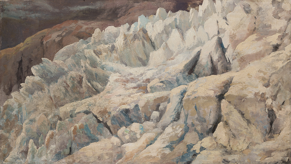 Federico Ashton (Milano 1840 - Valico Del Sempione 1904) - (Attribuito) "Seracchi" olio su tela (cm 34x60) Al retro: cartiglio iscritto "Seracchi Domodossola 190(?)" Si tratta probabilmente dello studio per il quadro "Il ghiacciaio del Rodano" In cornice