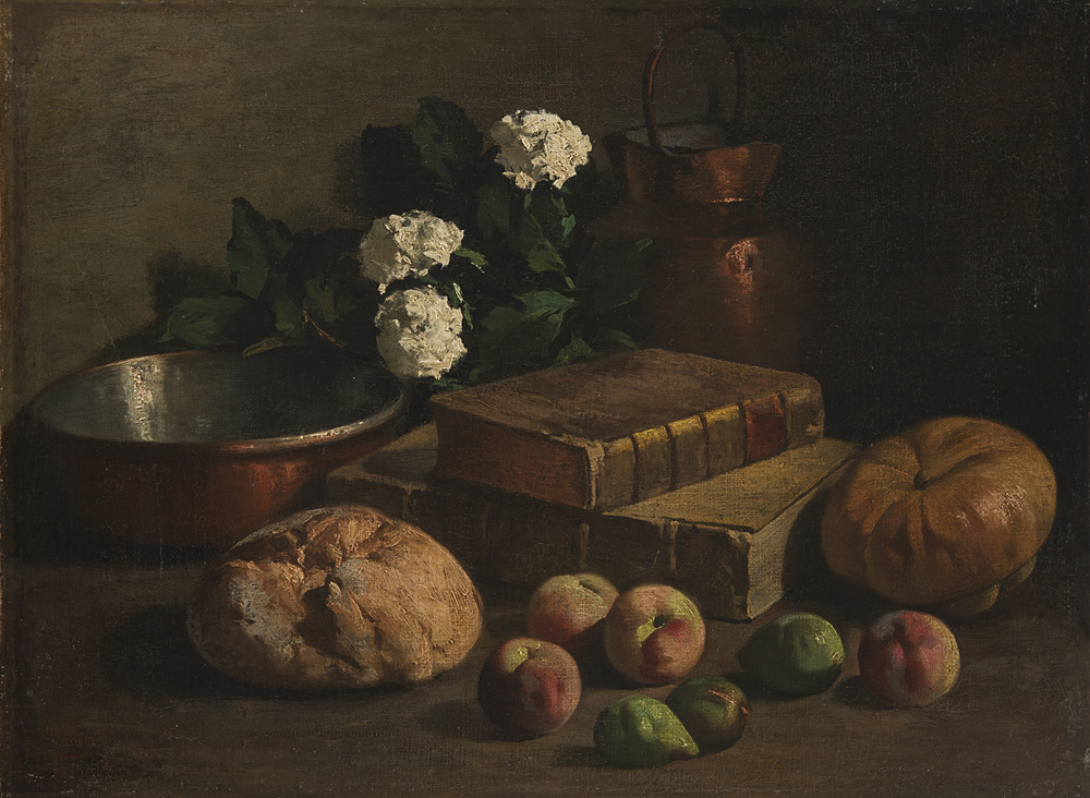 Maestro del XIX secolo "Composizione con libri, frutta, fiori e rami" olio su tela (cm 61.5x82) Reca firma G.Toma in basso a sinistra In cornice