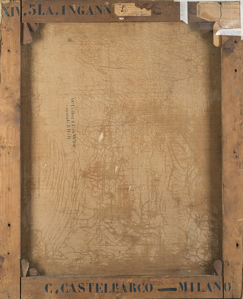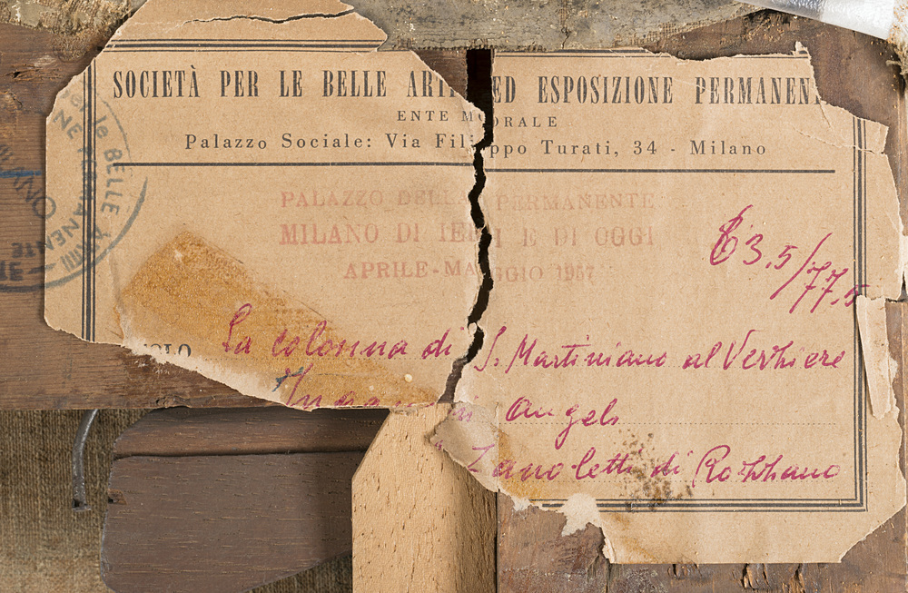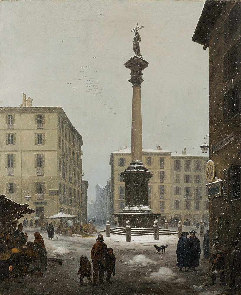 Angelo Inganni (Brescia 1807 - Gussago (BS) 1880) - "La colonna di S.Martiniano al Verziere con effetto di neve" 1845 olio su tela (cm 77.5x64) Firmato e datato in basso a destra. Ritocchi alla firma Al retro: cartigli e timbri Esposizioni: 1955, Brescia "Mostra dei dipinti di Angelo Inganni" circolo provinciale bresciano. Cartiglio al retro; 1957, Milano,Società per le Belle Arti ed Esposizione Permanente, mostra "Milano di Ieri e di Oggi attraverso l'arte". Cartiglio e timbri al retro Bibliografia: E.Sioli Legnani "Poesia di Milano" Milano 1940, opera citata e riprodotta a colori a pag.94, tav.39; P.Arrigoni - O.Vergani "Addio vecchia Milano!" Milano 1958, opera citata a pag.86 e riprodotta a colori a pag.87