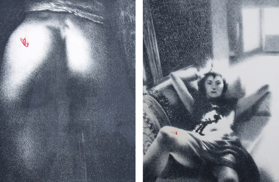 A-B) "La figlia era nuda" 2005, litografia originale ritoccata a mano dall'artista, cm 40x30. Firma in basso a destra. Timbro a secco della stamperia in basso a sinistra.