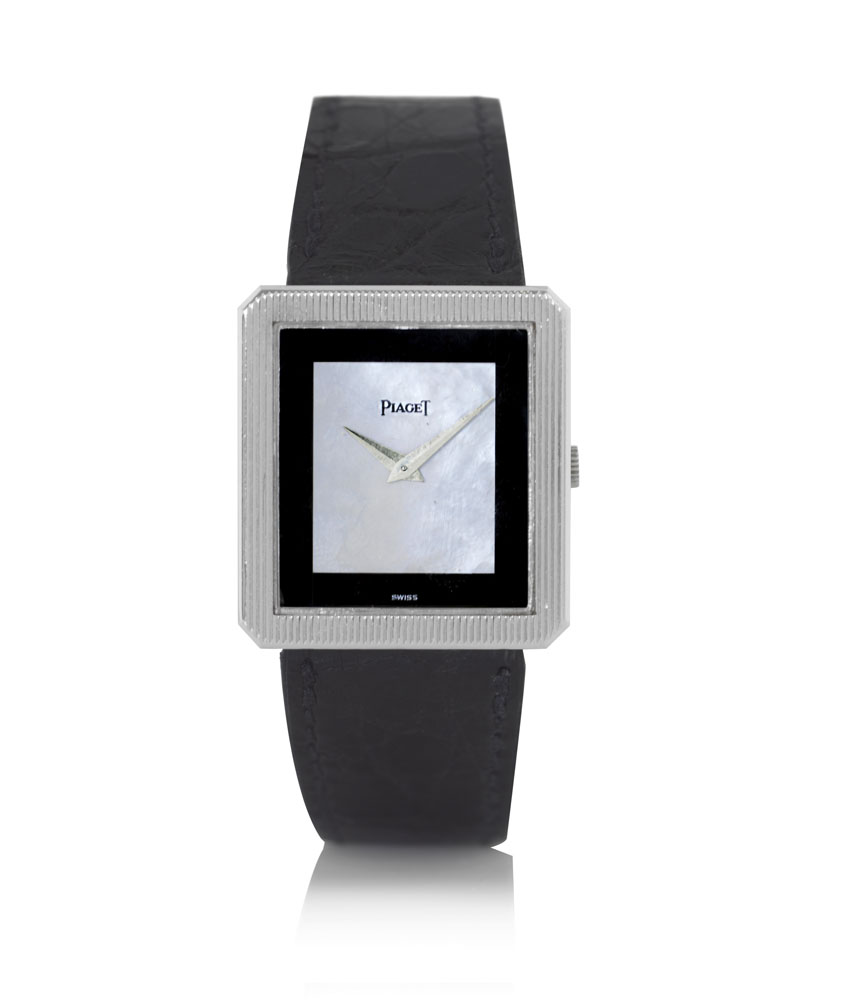 C. rettangolare in acciaio con angoli tronchi. Q. in onice e madreperla. M. a carica manuale. Quadrante, cassa e movimento firmati. Completo di fibbia in acciaio originale.