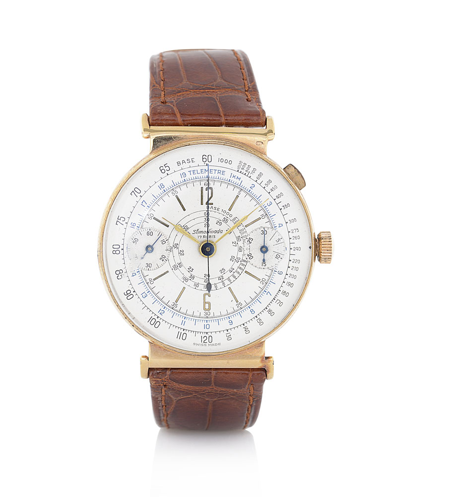 C. n. 421491 in oro giallo 18 kt con pulsante ad oliva al 2, fondello a cerniera ed anse fisse. Q. argentato con indici e numeri arabi smaltati, contatore a 30 minuti, scala tachimetrica a chiocciola, telemetrica e tachimetrica periferiche. M. a carica manuale. Quadrante firmato, cassa numerata.