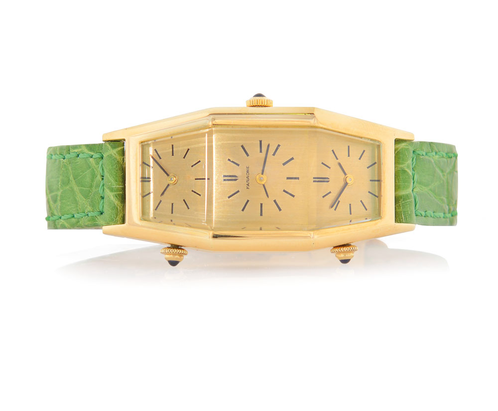 C. massiccia tonneau, arcuata in oro giallo 18 kt con tre corone e vetro azzurrato sagomato. Q. in oro diviso in tre quadranti con indici smaltati. M. tre indipendenti a carica manuale. Quadrante firmato Faraone, movimenti firmati Juvenia. Completo di fibbia deployante in oro giallo 18 kt.