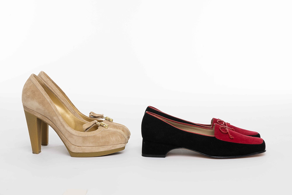 Salvatore Ferragamo e Sergio Rossi: lotto di due paia di scarpe uno in suede color beige (tacco 10 in para di gomma in confezione originale) e l'altro color rubino a tacco basso, mis. 37 e 37 1/2 (lievi difetti)