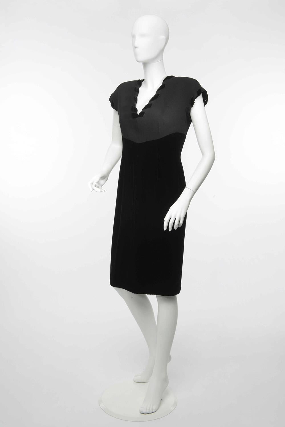 Valentino Boutique: abito corto da sera, smanicato e con scollo ampio a V in crépe di seta e velluto color nero, bordure con inserti a torchon, tg 12 (lievi difetti)