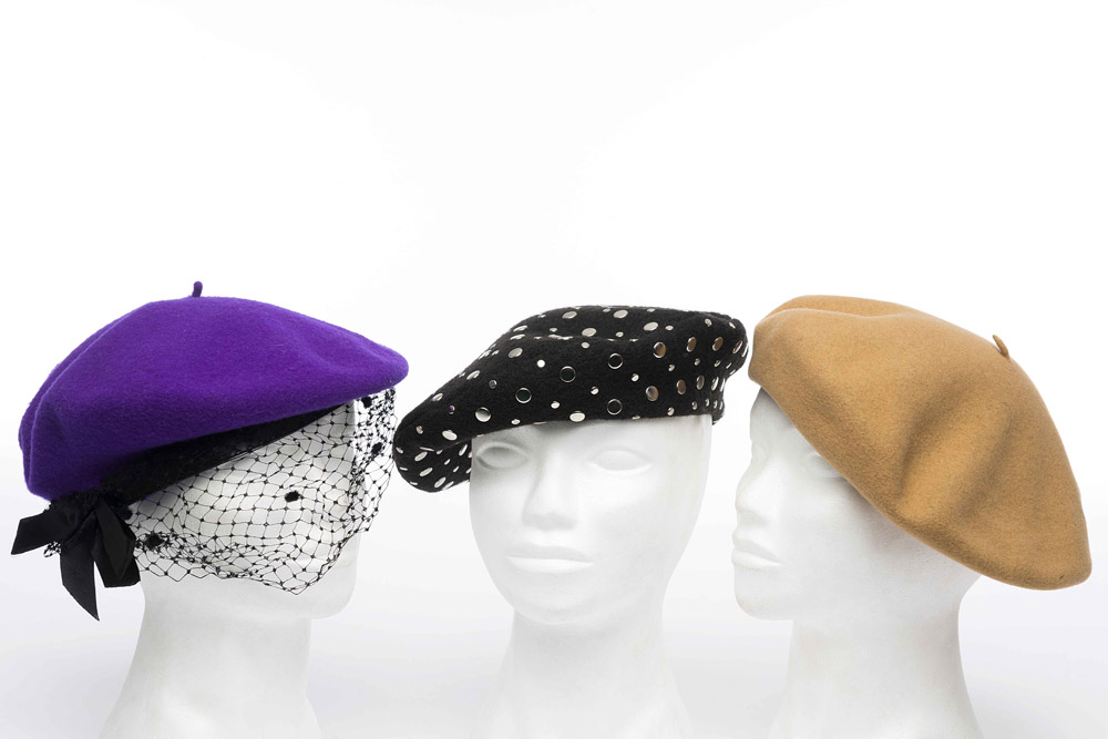 Sonia Rykiel, Jean Charles Brosseau Paris, Willough by Paris: lotto composto da tre baschi uno color cammello, uno viola con pizzo e nastro nero e uno nero con borchie